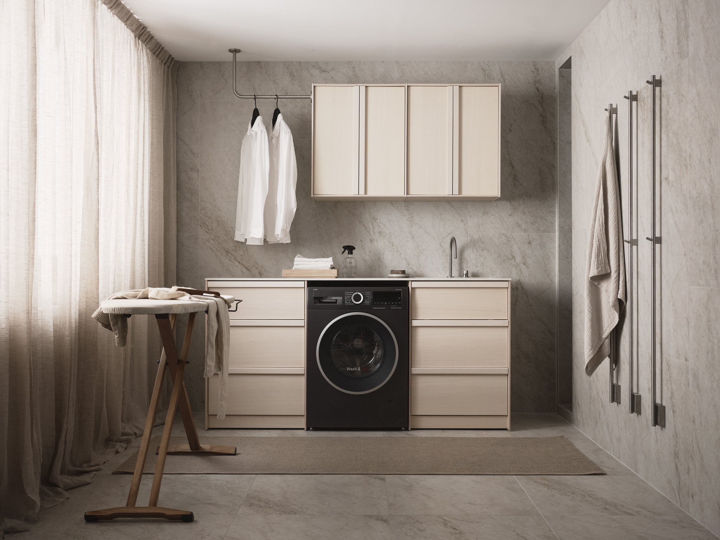 1 × Underskap H2/UC60 Kombi, Light Ash Wood med lange dekkplater, pluss en ekstra dekkplate for å ramme inn vaskemaskinen.