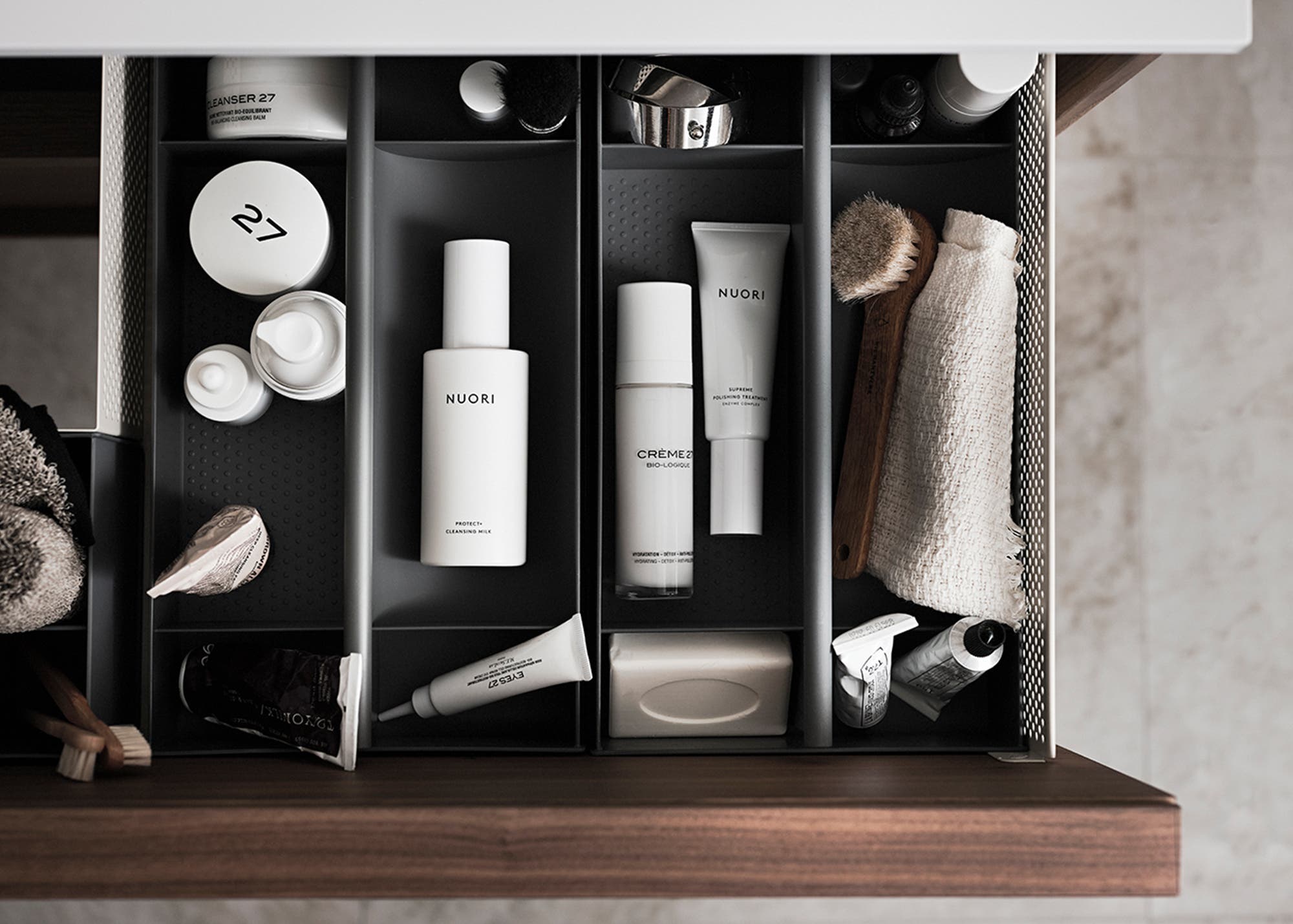 Havens unike skuffkonstruksjon i lettmetall med uttakbar innredning (Toolbox) gir deg mer plass og bedre orden i baderomsskapet. Det perforerte materialet slipper inn lys og gir et elegant inntrykk som dessuten er lett å holde rent.