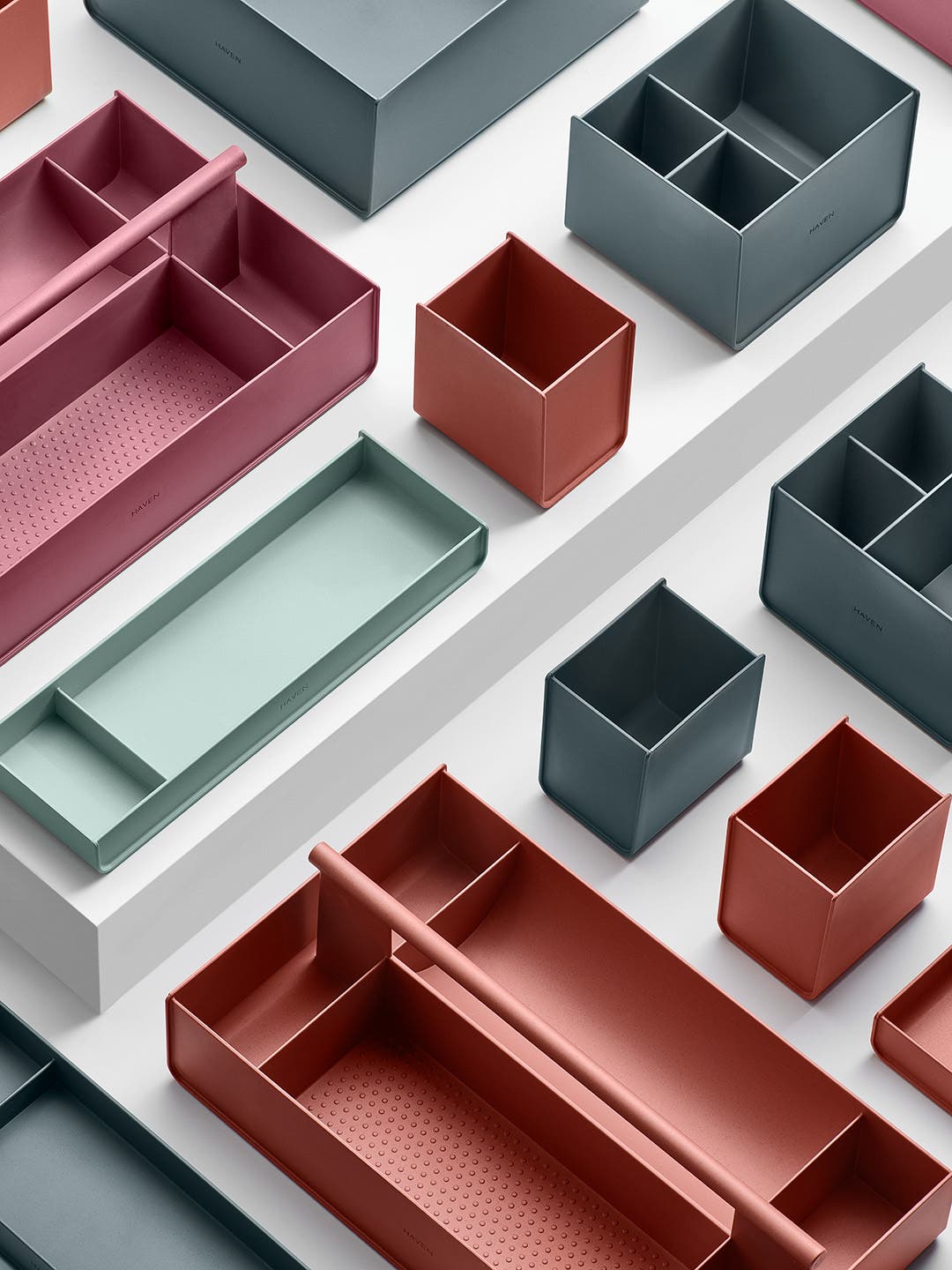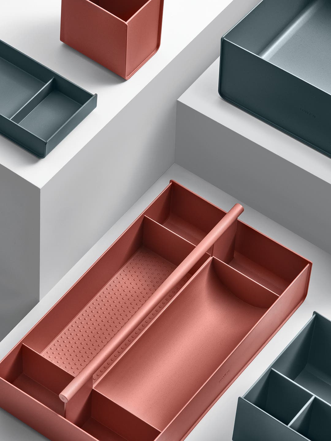 Vår lette og stabile skuffkonstruksjon av metall er lakkert i en matchende farge, og de smarte uttakbare skuffinnsatsene finnes i et antall komplementærfarger som kan blandes for en personlig kombinasjon. De er laget av et slitesterkt naturmateriale som består av vegetabilsk stivelse forsterket med bambusfibre. Dette gjør at skuffen er biologisk nedbrytbar når den en dag har gjort sitt.