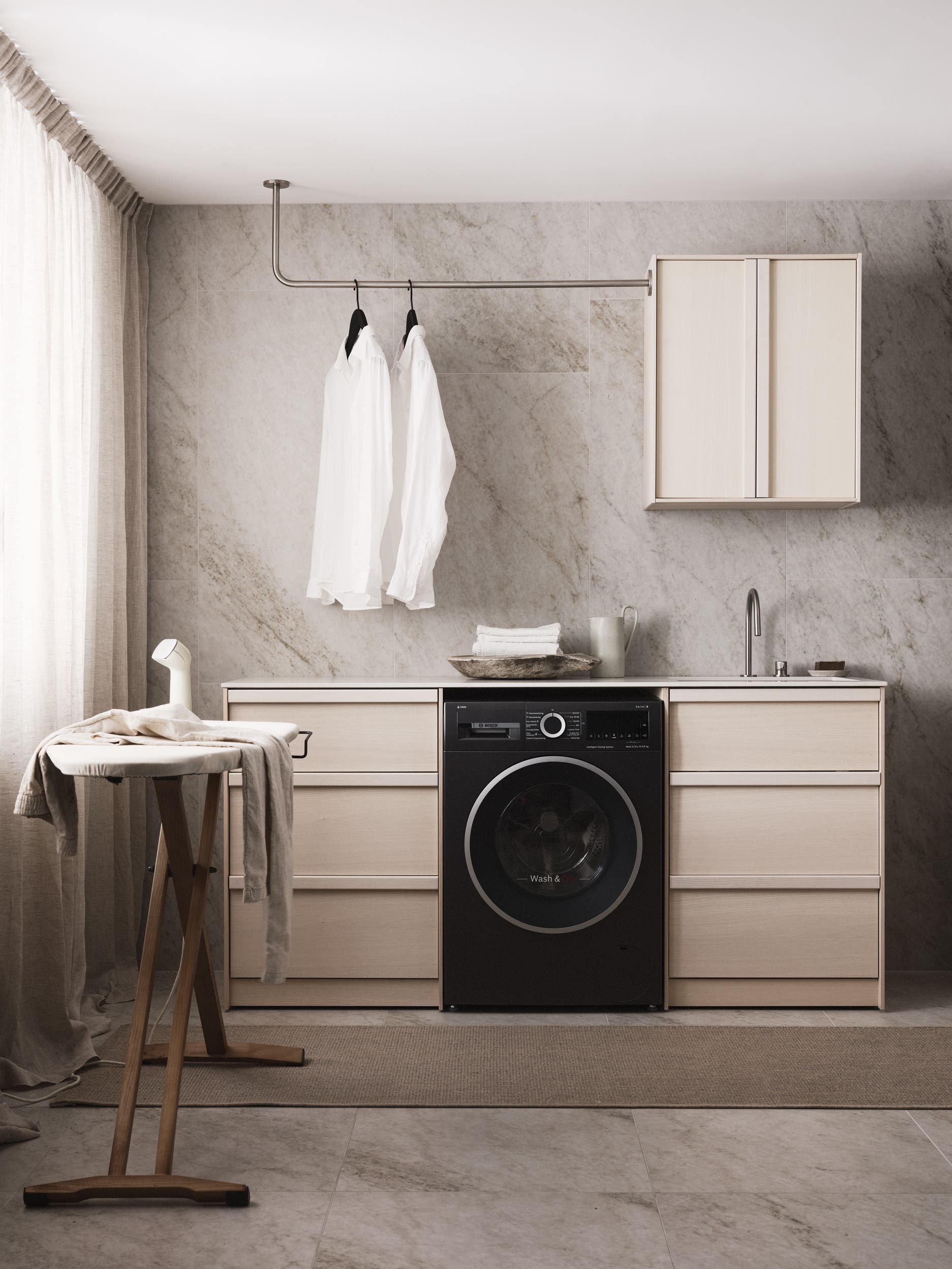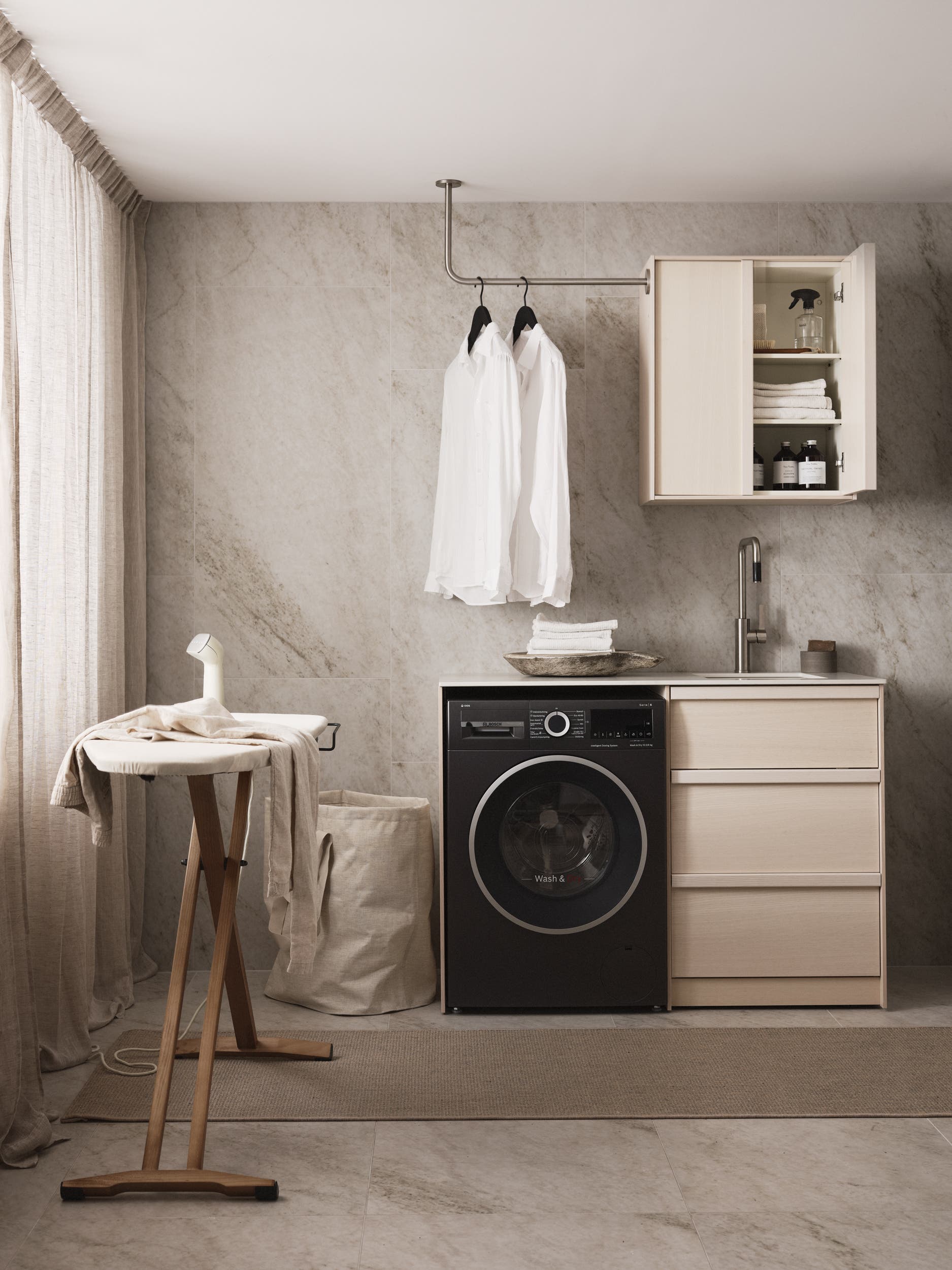1 × Underskap H2/UC60 Kombi, Light Ash Wood med lange dekkplater, pluss en ekstra dekkplate for å ramme inn vaskemaskinen.